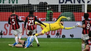 หน้าแรก » จานลุยจิ ดอนนารุมม่า เจรจา ยานแม่ » Gianluigi Donnarumma of AC Milan saves on Piotr Zielinski of SSC Napoli during the Serie A football match between AC Mi